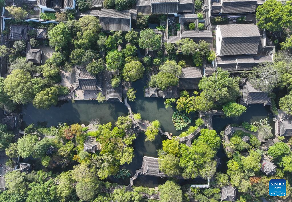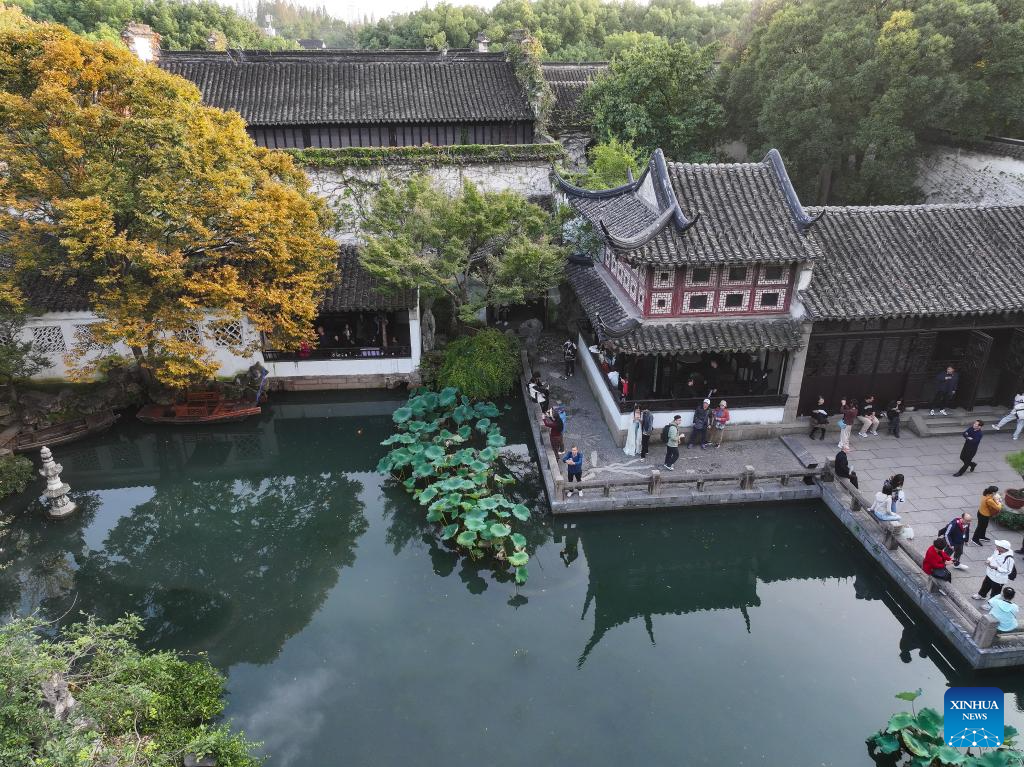 A drone photo taken on Oct. 23, 2024 shows tourists visiting the Lingering Garden in Suzhou, east China's Jiangsu Province. About a 20-minute ride by high-speed train from east China's Shanghai, Suzhou is one of the richest cities in China, with its more than 100 classical gardens considered some of the most beautiful in the country, and nine of them serving as UNESCO world heritage sites.