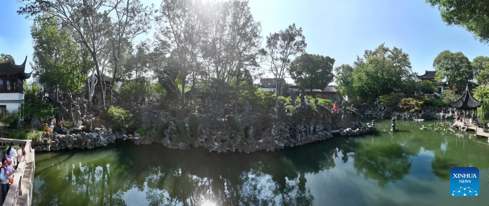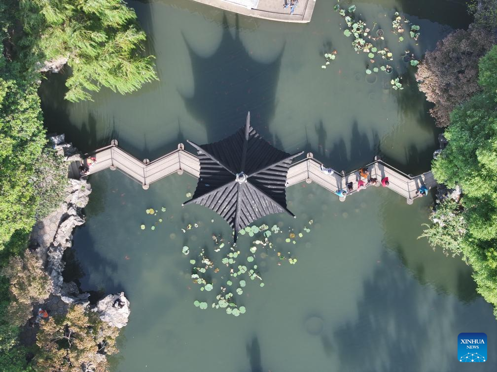 A drone photo taken on Oct. 23, 2024 shows people visiting Lion Grove Garden in Suzhou, east China's Jiangsu Province. About a 20-minute ride by high-speed train from east China's Shanghai, Suzhou is one of the richest cities in China, with its more than 100 classical gardens considered some of the most beautiful in the country, and nine of them serving as UNESCO world heritage sites.