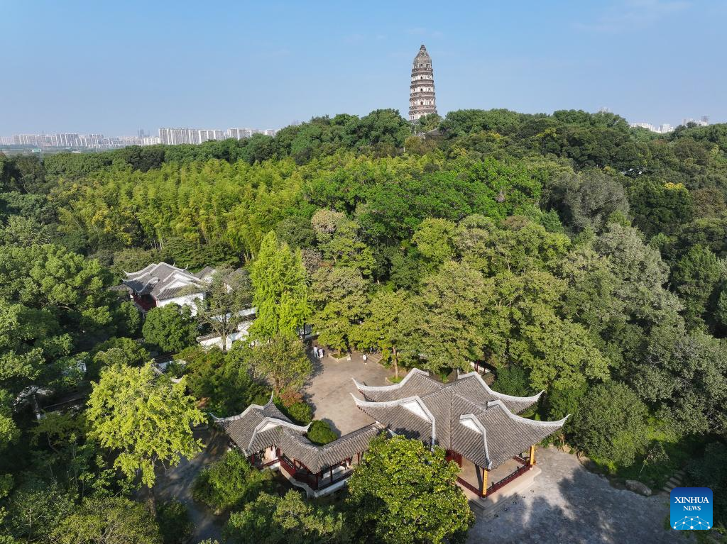 A drone photo taken on Oct. 23, 2024 shows the scenery at the Tiger Hill scenic area in Suzhou, east China's Jiangsu Province. About a 20-minute ride by high-speed train from east China's Shanghai, Suzhou is one of the richest cities in China, with its more than 100 classical gardens considered some of the most beautiful in the country, and nine of them serving as UNESCO world heritage sites.
