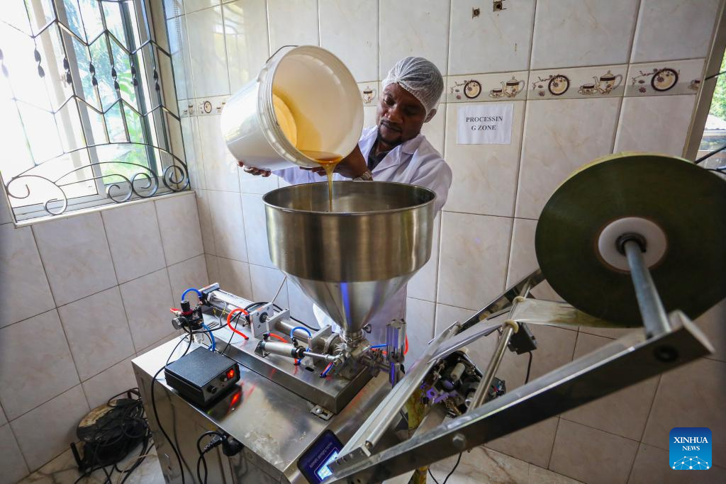 Jackson Mponela, production manager for commerce and development at Tanzania Future Enterprises Company Limited, prepares to package honey in bottles at a factory in Dar es Salaam, Tanzania, on Oct. 28, 2024. Four employees of a honey processing company located at Goba, 18 kilometers north of Tanzania's port city of Dar es Salaam, are busy making final preparations for participation in the seventh edition of the China International Import Expo (CIIE), which will be held in Shanghai from Nov. 5 through Nov. 10. (Photo by Emmanuel Herman/Xinhua)