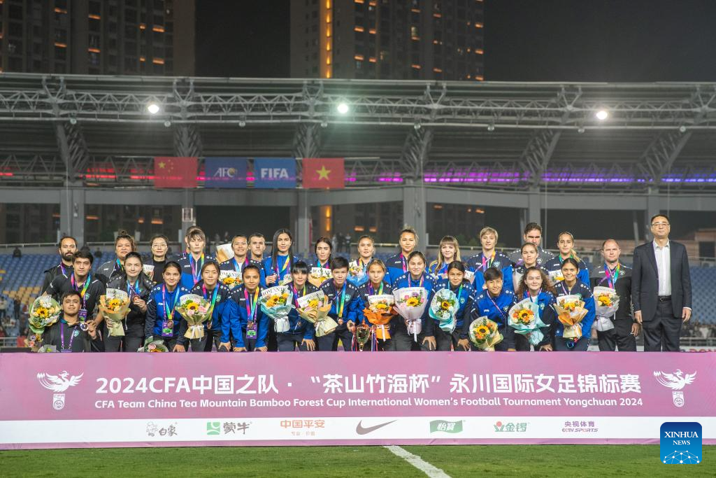 Team China celebrate winning champion during the awarding ceremony after the match between China and Vietnam at 2024 CFA Team China International Women's Football Tournament Yongchuan in Chongqing, southwest China, Oct. 29, 2024. (Xinhua/Huang Wei)