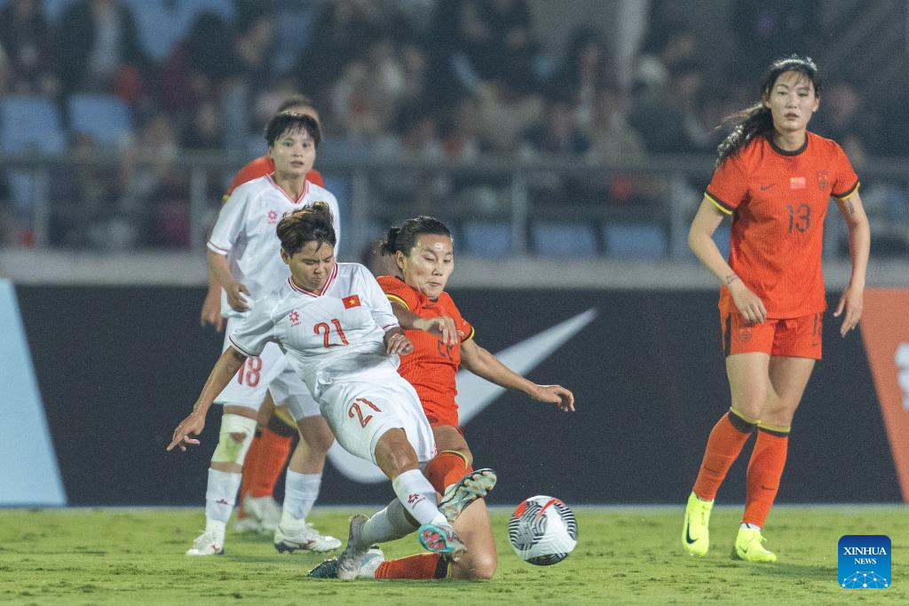Gao Chen (front R) of China vies with Ngan Thi Van Su (front L) of Vietnam during the match at 2024 CFA Team China International Women's Football Tournament Yongchuan in Chongqing, southwest China, Oct. 29, 2024. (Xinhua/Huang Wei)
