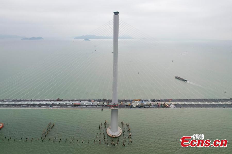 Asphalt pavement on the cross-sea link, which is another artery in the Guangdong-Hong Kong-Macao Greater Bay Area after the Hong Kong-Zhuhai-Macao Bridge and Shenzhen-Zhongshan link, was completed Tuesday.