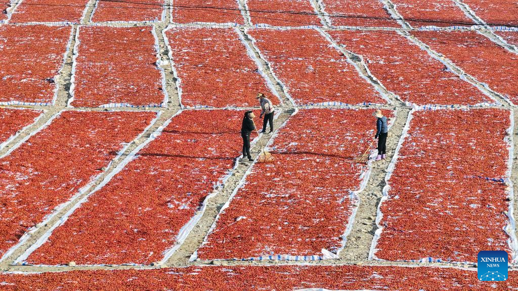 A drone photo taken on Oct. 30, 2024 shows farmers airing hawthorns in Zunhua City, north China's Hebei Province. (Photo by Liu Mancang/Xinhua)
