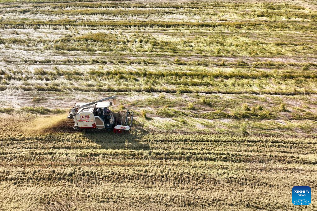 An aerial drone photo taken on Oct. 30, 2024 shows a harvester working at a rice field in Xinbei District of Changzhou City, east China's Jiangsu Province. (Photo by Chen Wei/Xinhua)