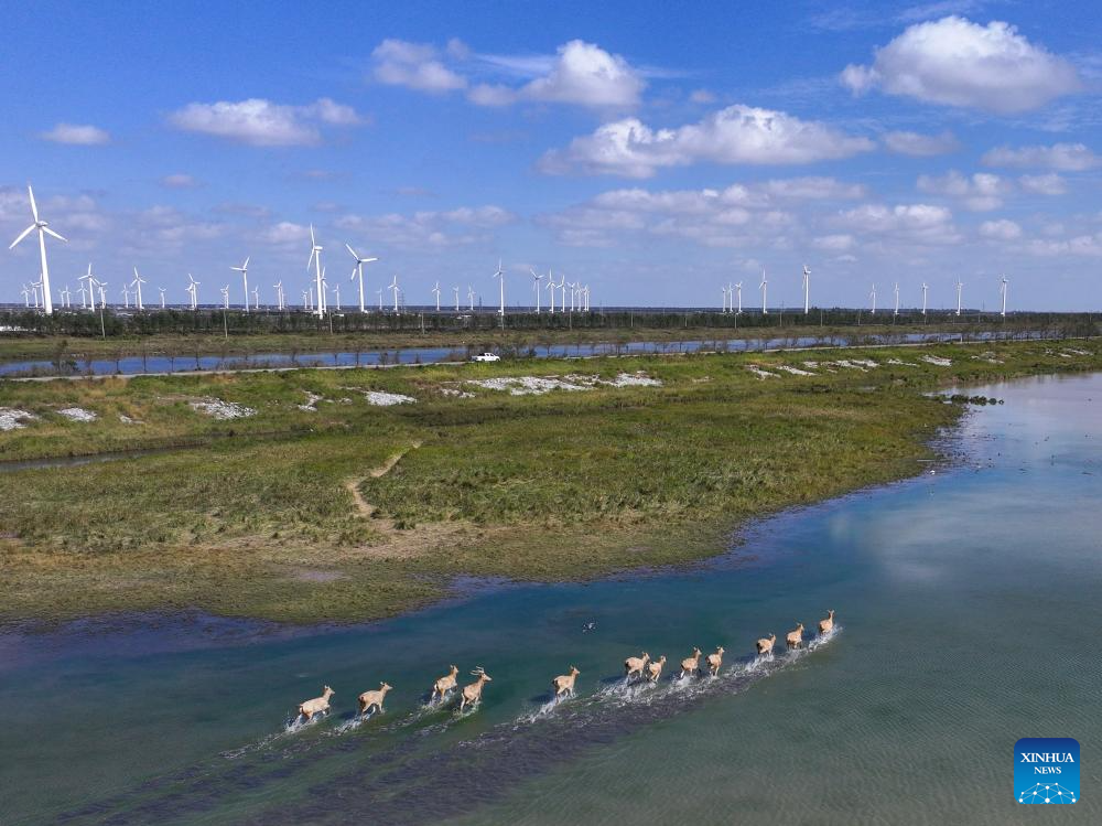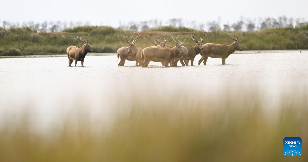 Milu deer are seen in Dafeng Milu National Nature Reserve in east China's Jiangsu Province, Oct. 28, 2024. Thanks to reinforced efforts in ecological protection and animal preservation, the Dafeng Milu National Nature Reserve has welcomed 825 newborns of milu deer, a species endemic to China, so far this year. The milu deer population here has exceeded 8,200, including some 3,500 living on their own in the wild. (Xinhua/Lyu Shuai)