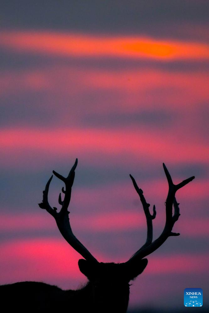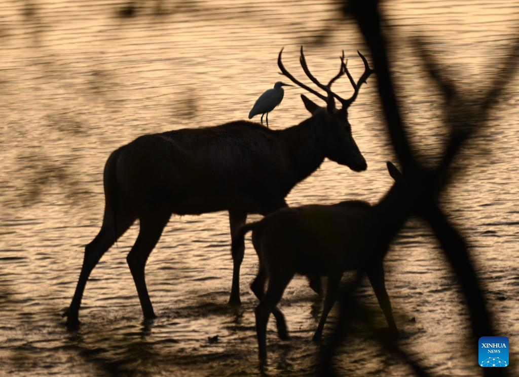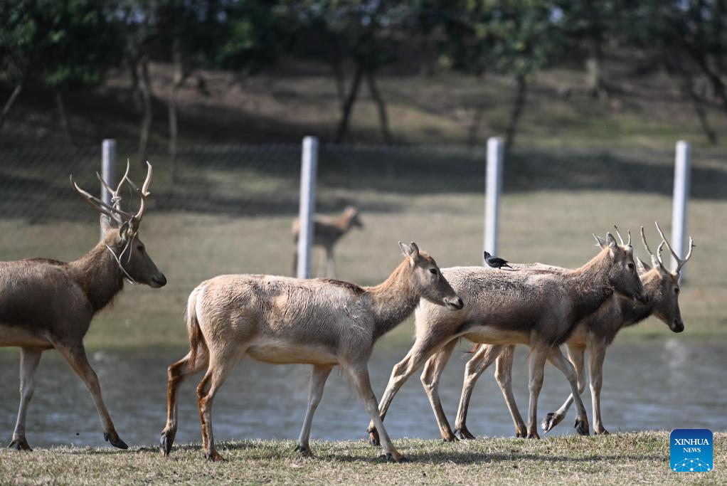 Milu deer are seen in Dafeng Milu National Nature Reserve in east China's Jiangsu Province, Oct. 28, 2024. Thanks to reinforced efforts in ecological protection and animal preservation, the Dafeng Milu National Nature Reserve has welcomed 825 newborns of milu deer, a species endemic to China, so far this year. The milu deer population here has exceeded 8,200, including some 3,500 living on their own in the wild. (Xinhua/Deng Hua)