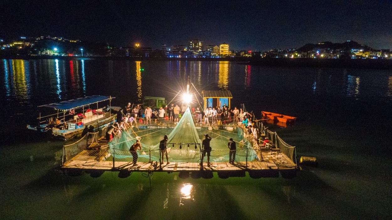 "Quick, quick, quick, catch it!" With a burst of cheers, Pu, a tourist from south China's Guangdong province, swiftly scooped up a freshly caught onespot seaperch with a net.