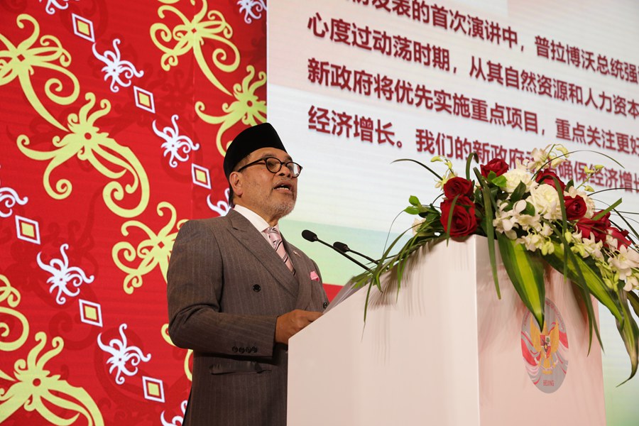 Djauhari Oratmangun, Indonesian ambassador to China delivers a speech at a reception to celebrate the 79th anniversary of Indonesia's independence in Beijing, Oct. 30, 2024. (People's Daily Online/Wang Quanjiao)