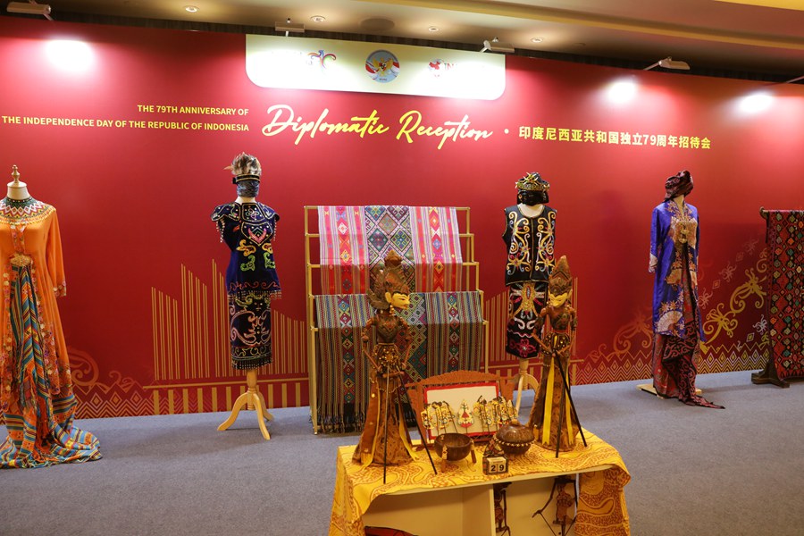 Photo taken on Oct. 30, 2024 shows traditional Indonesian costumes displayed at a reception to celebrate the 79th anniversary of Indonesia's independence in Beijing, Oct. 30, 2024. (People's Daily Online/Wang Quanjiao)