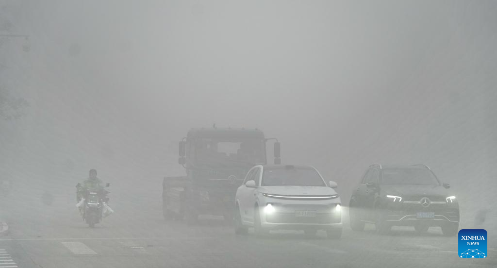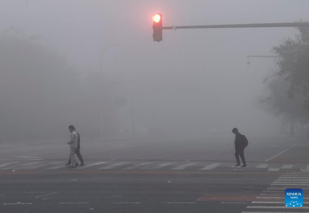 People walk on a street amid fog in Beijing, capital of China, Nov. 2, 2024. (Xinhua/Ren Zhenglai)