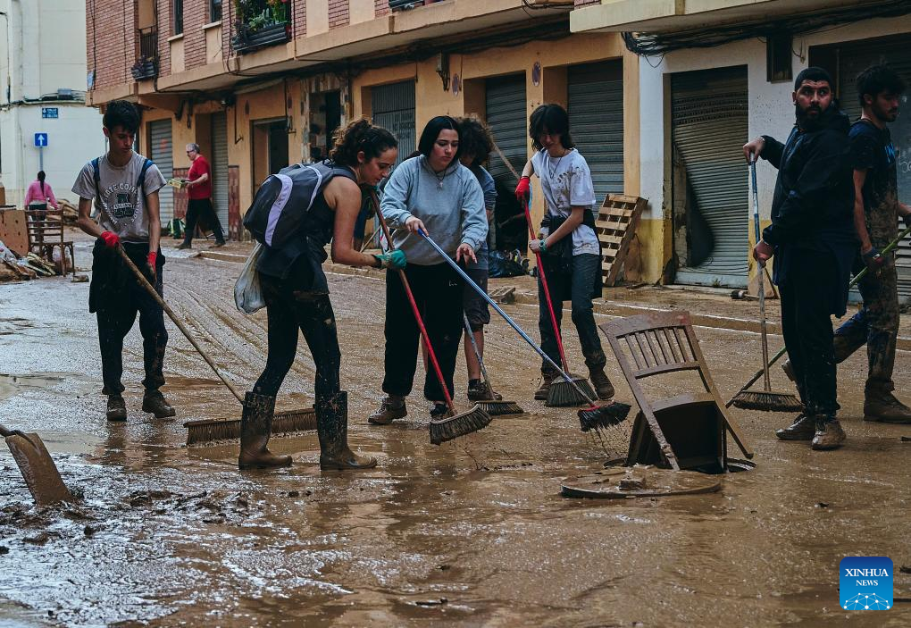 People clean up a flood-hit street in Valencia, Spain, Nov. 1, 2024. Spain remains deeply shaken by the deadly flash floods that have left 205 people confirmed dead and wrecked havoc across the regions of Valencia, Castilla-La Mancha and Andalusia in the east and southeast parts of the country. As of Friday, many more are still unaccounted for. (Photo by Pablo Morano/Xinhua)