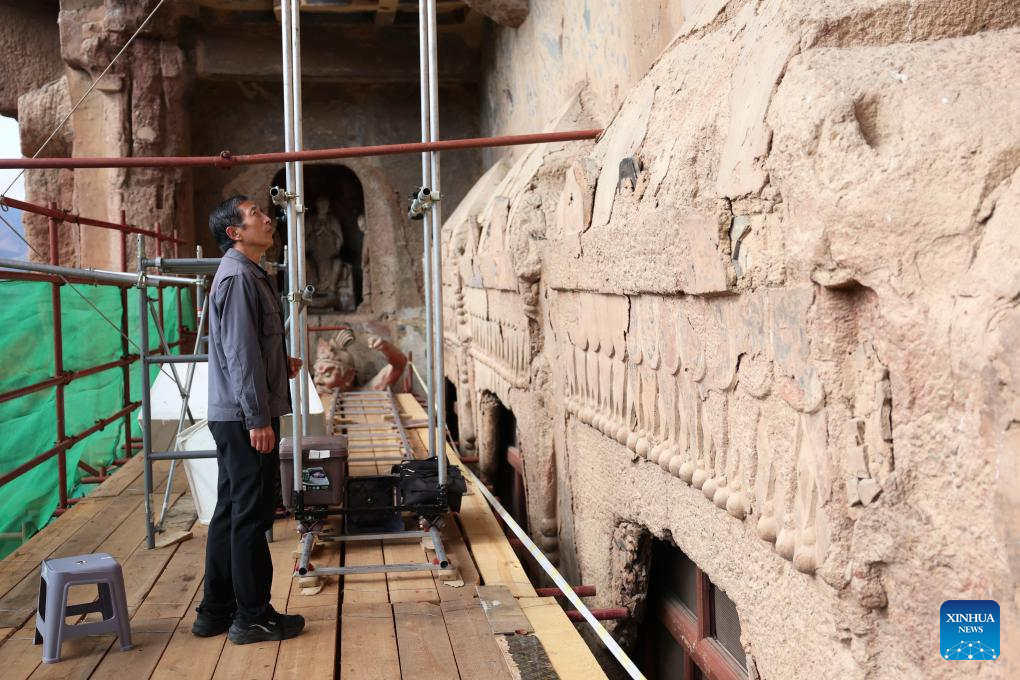 Dong Guangqiang, director of the digital center of Maiji Mountain Grottoes art institute, checks the mural sculptures at the Maiji Mountain Grottoes in Maiji District of Tianshui City, northwest China's Gansu Province on Nov. 2, 2024. The Maiji Mountain Grottoes is one of the four most famous grottoes in China. In the past three years, 29 caves here have been protected and reinforced as Maiji Mountain Grottoes art institute and other cultural relics protection organizations have employed scientific and technological methods to ensure the grottoes remain well-preserved. (Xinhua/Chen Bin)