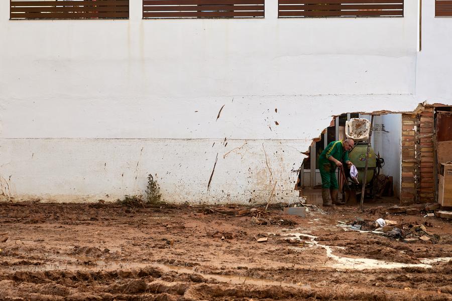 A resident clears his residence after flood in Utiel, Spain, Nov. 2, 2024. Torrential rains over recent days have triggered Spain's worst flooding in decades. (Xinhua/Meng Dingbo)