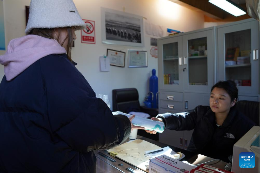A staff member (R) provides an oxygen cylinder to a tourist at a medical service station at Yading scenic spot in Daocheng County of Tibetan Autonomous Prefecture of Garze, southwest China's Sichuan Province, Oct. 31, 2024. (Xinhua/Xu Bingjie)