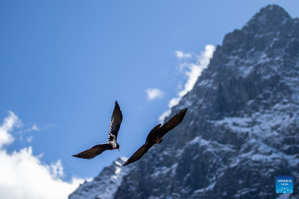 Red-billed choughs are pictured at Yading scenic spot in Daocheng County of Tibetan Autonomous Prefecture of Garze, southwest China's Sichuan Province, Oct. 31, 2024. (Xinhua/Chu Jiayin)