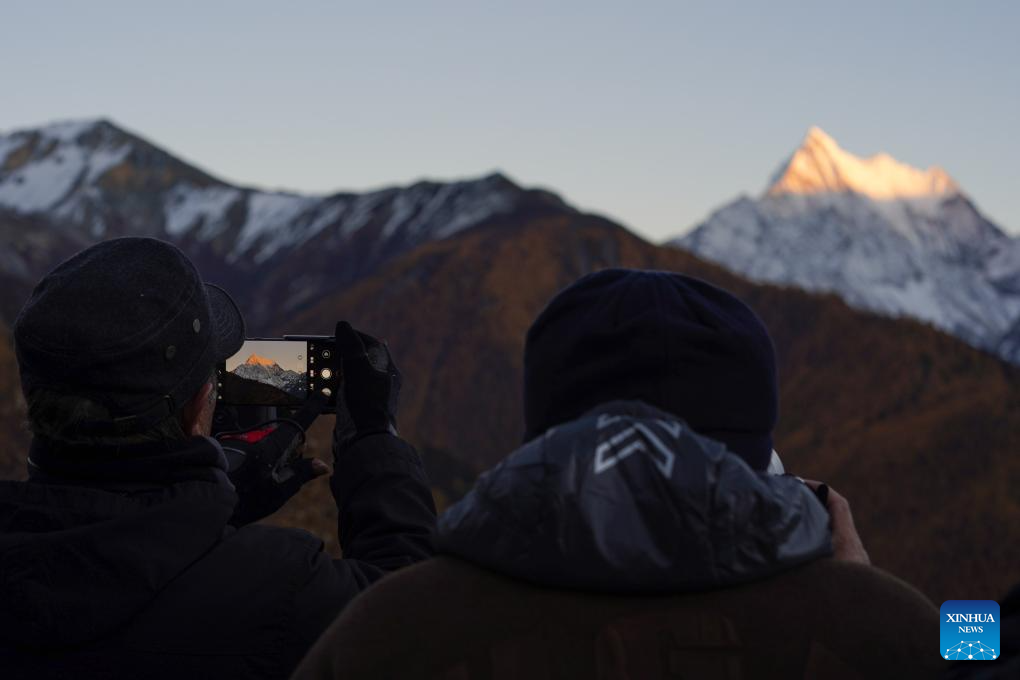 Tourists take photos during sunset at the Yading scenic spot in Daocheng County of Tibetan Autonomous Prefecture of Garze, southwest China's Sichuan Province, Oct. 31, 2024. (Xinhua/Xu Bingjie)
