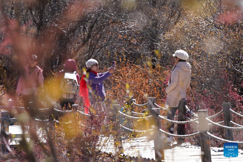 Tourists pose for photos at the Yading scenic spot in Daocheng County of Tibetan Autonomous Prefecture of Garze, southwest China's Sichuan Province, Oct. 31, 2024. (Xinhua/Xu Bingjie)