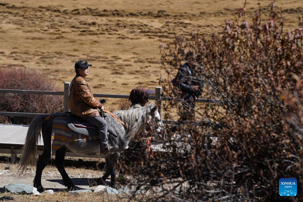 A tourist rides a horse at the Yading scenic spot in Daocheng County of Tibetan Autonomous Prefecture of Garze, southwest China's Sichuan Province, Oct. 31, 2024. (Xinhua/Xu Bingjie)