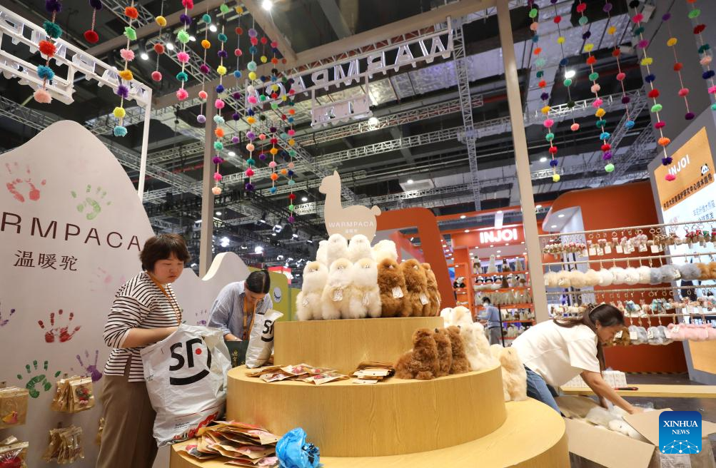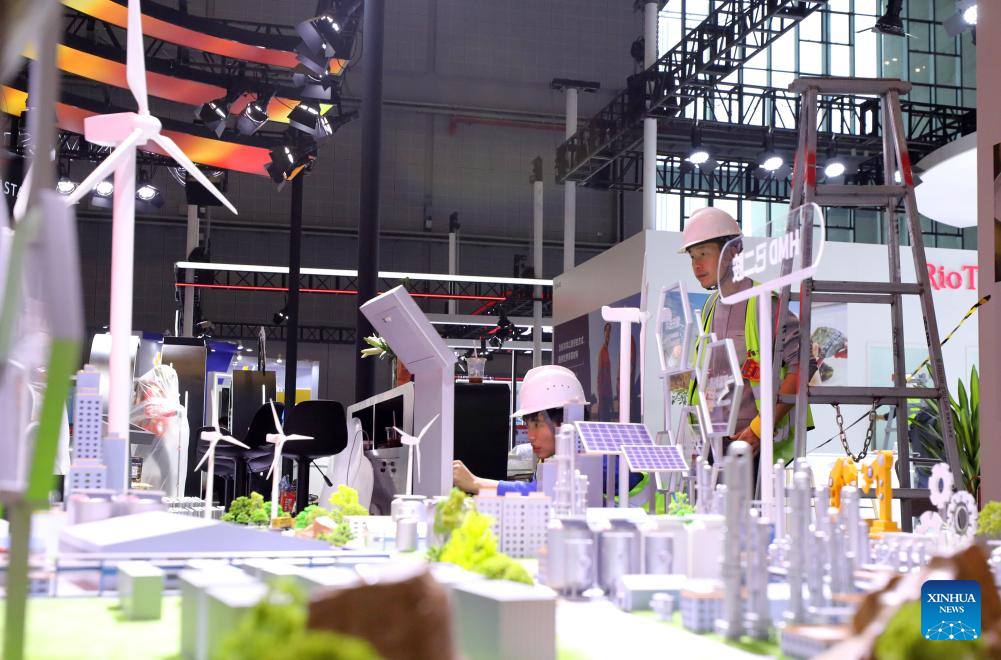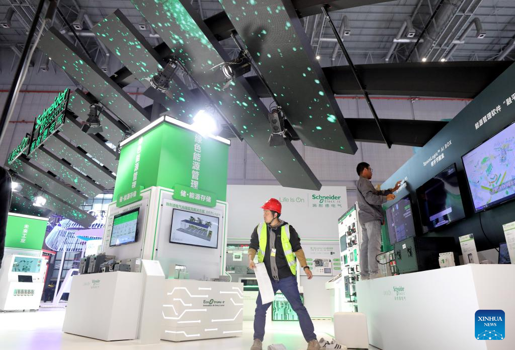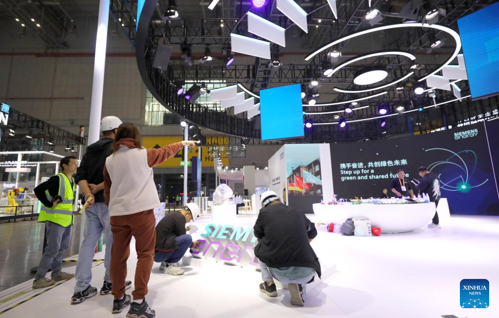 Exhibitors make preparations at the National Exhibition and Convention Center (Shanghai), the main venue for the 7th China International Import Expo (CIIE), in east China's Shanghai, Nov. 2, 2024. Preparations for the 7th CIIE, which is scheduled to take place in Shanghai from Nov. 5 to 10, have entered the final stage. (Xinhua/Fang Zhe)