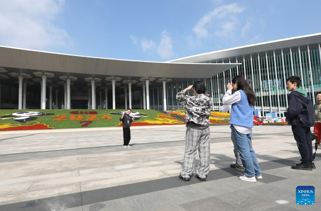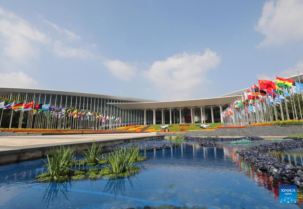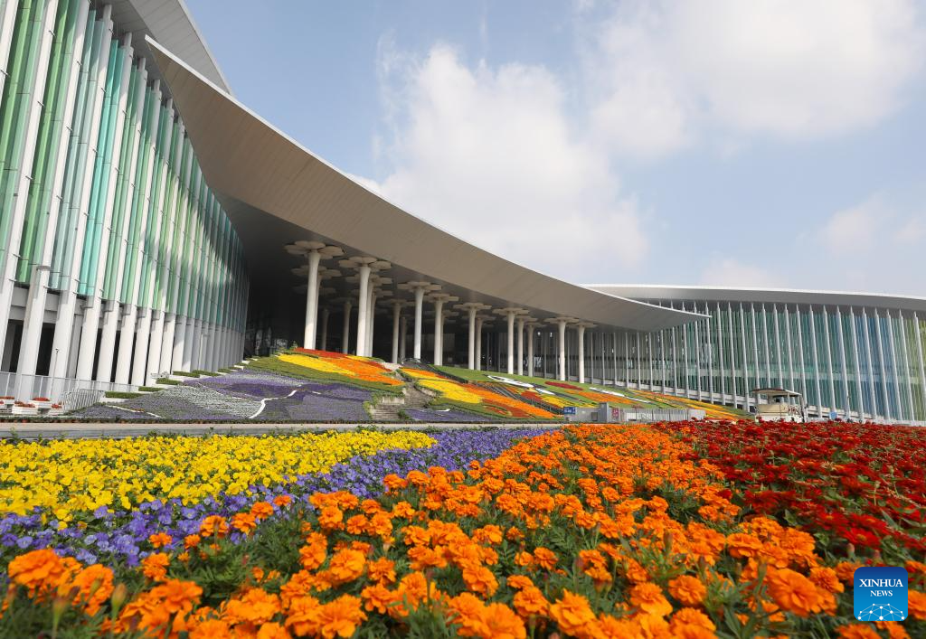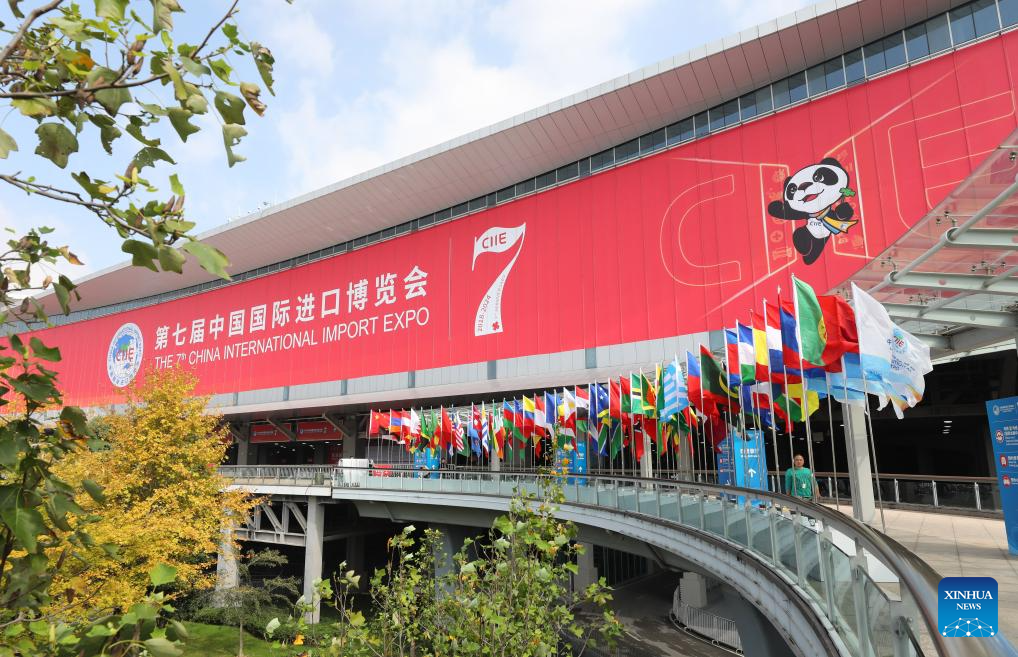 This photo taken on Nov. 2, 2024 shows the south square of the National Exhibition and Convention Center (Shanghai), the main venue for the 7th China International Import Expo (CIIE), in east China's Shanghai. Preparations for the 7th CIIE, which is scheduled to take place in Shanghai from Nov. 5 to 10, have entered the final stage. (Xinhua/Fang Zhe)