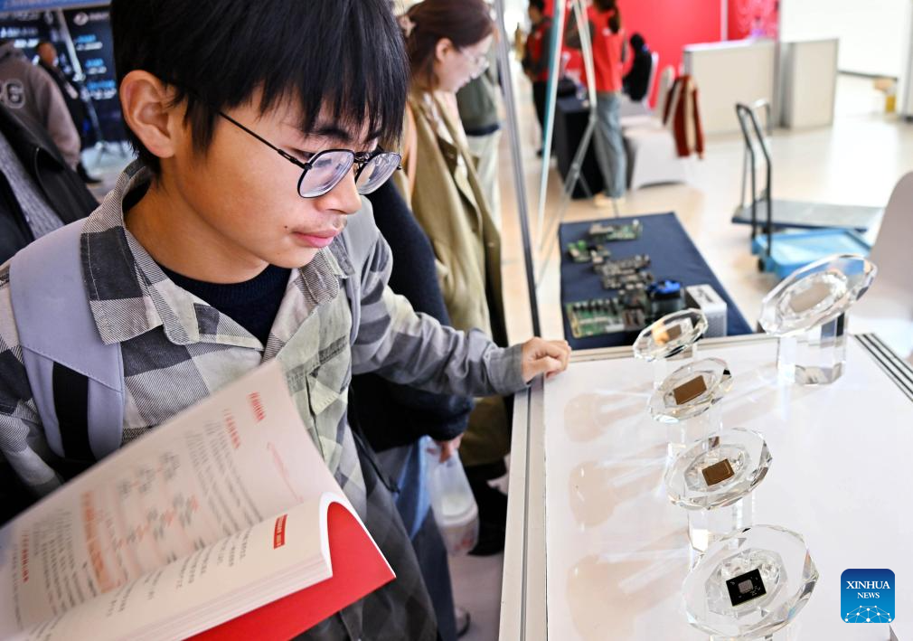A participant looks at domestic chips at the exhibition area of the 2024 China Automation Congress in Qingdao, east China's Shandong Province, Nov. 2, 2024. The 2024 China Automation Congress, which focuses on the deep integration of automation and artificial intelligence as well as explores the innovative development of new industries and technologies, would last from Nov. 1 to Nov. 3 here. (Xinhua/Li Ziheng)