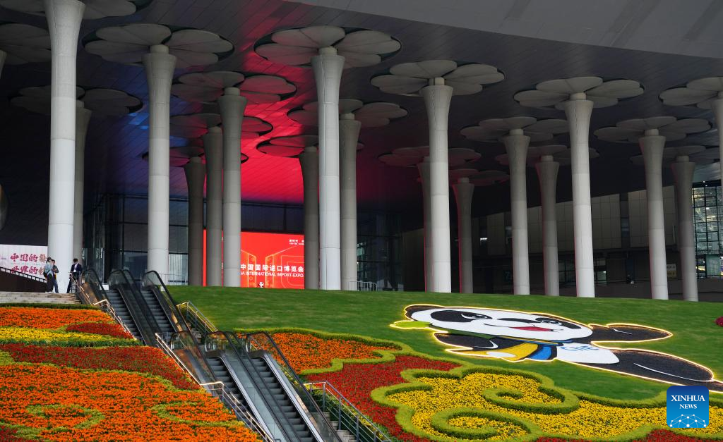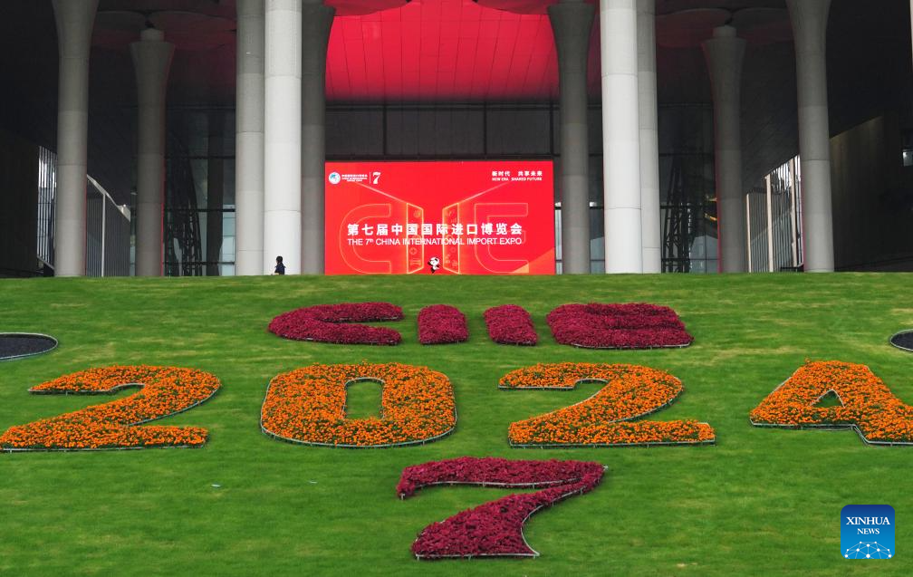 This photo taken on Nov. 2, 2024 shows the south square of the National Exhibition and Convention Center (Shanghai), the main venue for the 7th China International Import Expo (CIIE), in east China's Shanghai. The center has been fully decorated to welcome the upcoming 7th CIIE, which is scheduled to take place in Shanghai from Nov. 5 to Nov. 10. (Xinhua/Liu Ying)