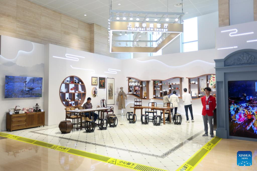 This photo taken on Nov. 3, 2024 shows an exhibition area for intangible cultural heritages of Shanghai at the media center for the 7th China International Import Expo (CIIE) at the National Exhibition and Convention Center (Shanghai) in Shanghai, east China. The media center of the 7th CIIE opened on Sunday to provide services for journalists. (Xinhua/Wang Xiang)