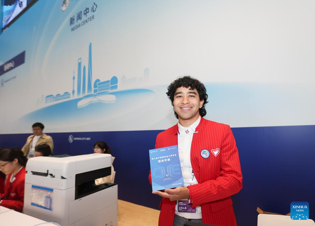 A Panamanian student of Tongji University who serves as a volunteer displays a media handbook at the media center for the 7th China International Import Expo (CIIE) at the National Exhibition and Convention Center (Shanghai) in Shanghai, east China, Nov. 3, 2024. The media center of the 7th CIIE opened on Sunday to provide services for journalists. (Xinhua/Wang Xiang)