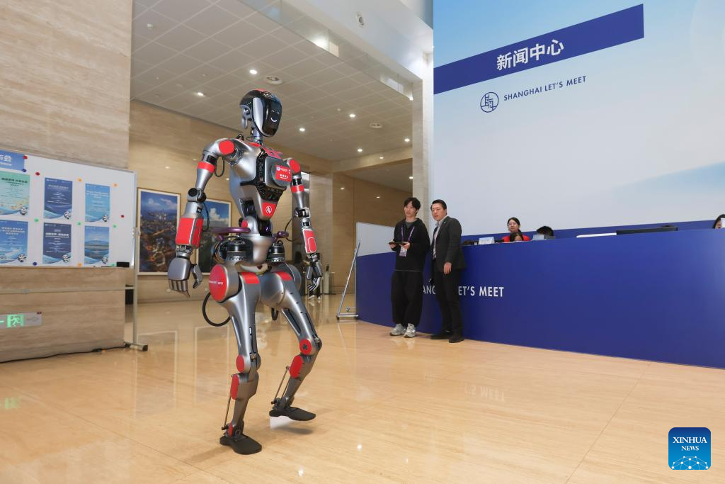 A humanoid robot providing inquiry service is pictured at the media center for the 7th China International Import Expo (CIIE) at the National Exhibition and Convention Center (Shanghai) in Shanghai, east China, Nov. 3, 2024. The media center of the 7th CIIE opened on Sunday to provide services for journalists. (Xinhua/Wang Xiang)