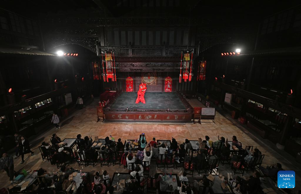People watch lion dance at the entrance of Guangdong Guild Hall in Nankai District, north China's Tianjin, Nov. 2, 2024. Guangdong Guild Hall, a century-old complex now serves as an opera museum in Tianjin, has recently introduced an interactive opera show. Since its debut, the show has provided its audience with an immersive experience of traditional Chinese opera art through multiple forms of interactions. (Xinhua/Zhao Zishuo)
