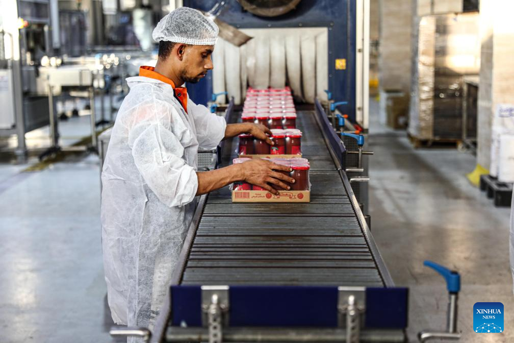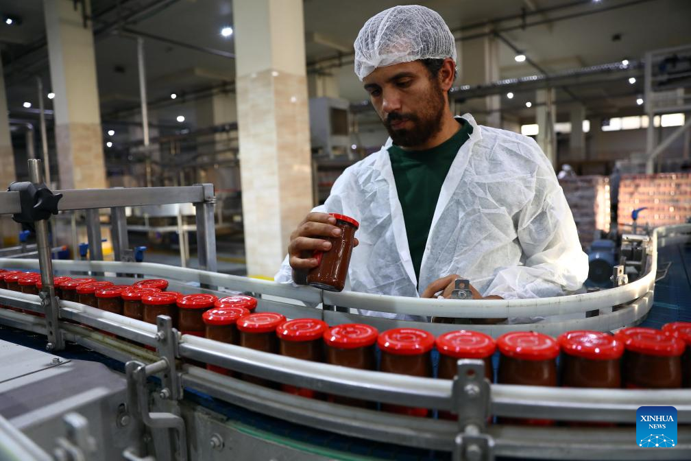 A worker checks bottled tomato paste at a production line of the Egyptian Swiss Group in Sharqia Governorate, Egypt, Oct. 27, 2024. (Xinhua/Ahmed Gomaa)