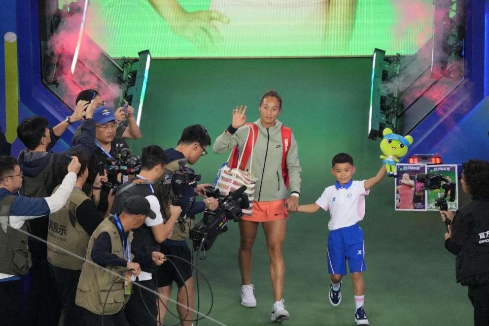 Chinese professional tennis player Zheng Qinwen enters the court of the quarterfinal of the WTA Wuhan Open tennis tournament, Oct. 11, 2024. (People's Daily Online/Zhou Guoqiang)