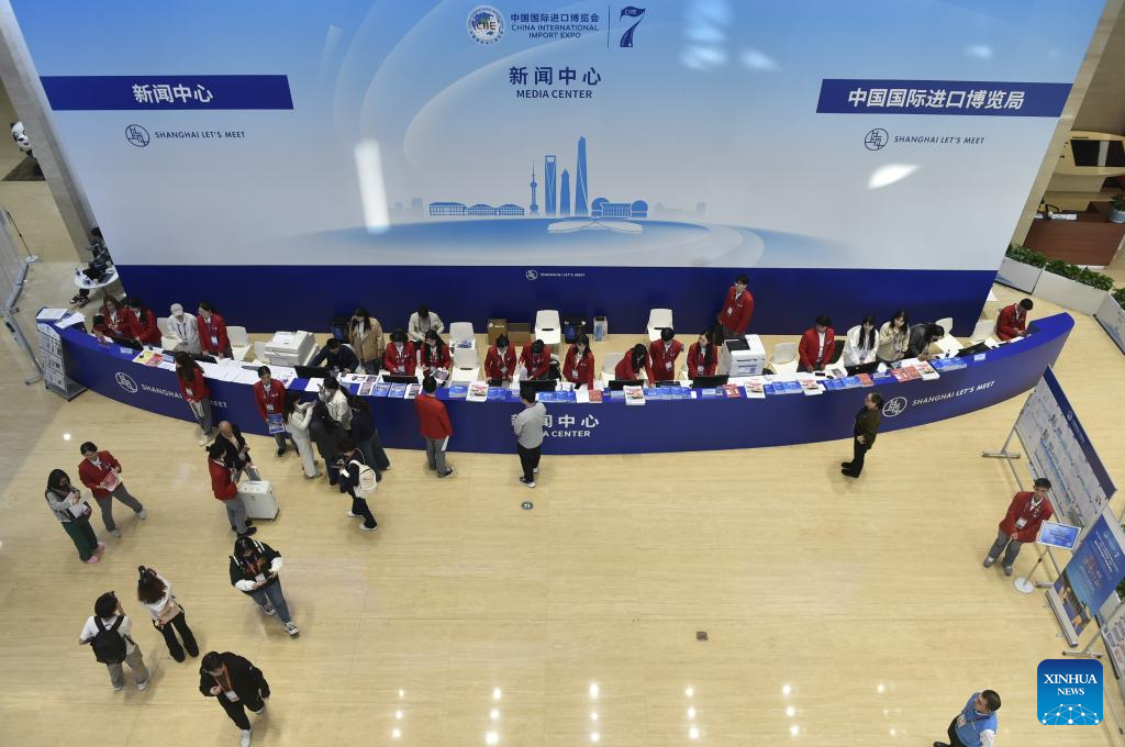 This photo taken on Nov. 4, 2024 shows the media center for the 7th China International Import Expo (CIIE) in Shanghai, east China. The 7th CIIE will be held in Shanghai from Nov. 5 to 10. (Xinhua/Lu Peng)