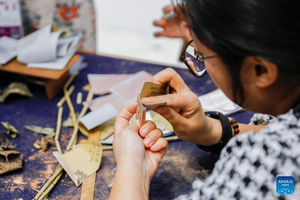 A media worker tries lacquerware making at the media center of the 7th China International Import Expo (CIIE) in Shanghai, east China, Nov. 4, 2024. The 7th CIIE will be held in Shanghai from Nov. 5 to 10. A variety of cultural activities at the media center attracted many media staff. (Photo by Chang Nengjia/Xinhua)