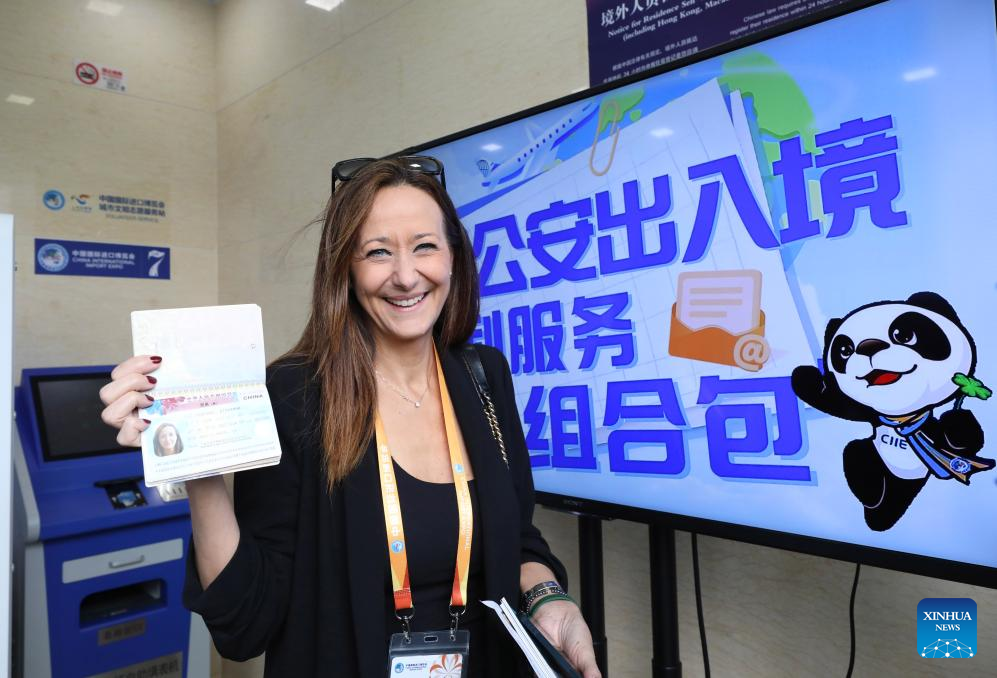 An Italian exhibitor shows her visa applied at the overseas personnel service station for the 7th China International Import Expo (CIIE) in Shanghai, east China, Nov. 4, 2024. The service station opened at the National Exhibition and Convention Center (Shanghai), the main venue for the 7th CIIE, on Monday. Shanghai has introduced a comprehensive range of services to suit the convenience of CIIE participants. (Xinhua/Fang Zhe)