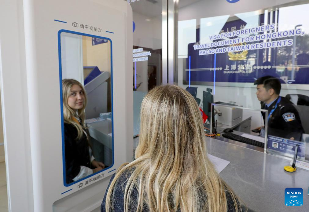 An Italian exhibitor (C) applies for a visa at the overseas personnel service station for the 7th China International Import Expo (CIIE) in Shanghai, east China, Nov. 4, 2024. The service station opened at the National Exhibition and Convention Center (Shanghai), the main venue for the 7th CIIE, on Monday. Shanghai has introduced a comprehensive range of services to suit the convenience of CIIE participants. (Xinhua/Fang Zhe)