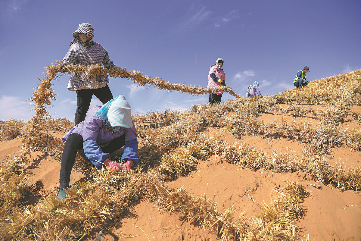 Workers plant grass grids for sand control in the Tengger Desert in Zhongwei, Ningxia Hui autonomous region, on May 30. (FENG KAIHUA/XINHUA)