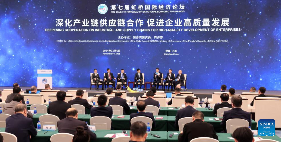 A sub-forum titled "Deepening Cooperation on Industrial and Supply Chains for High-quality Development of Enterprises" is held during the 7th Hongqiao International Economic Forum in Shanghai, east China, Nov. 6, 2024. (Xinhua/Yin Gang)