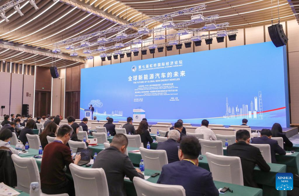 A sub-forum titled "The Future of Global New Energy Vehicles" is held during the 7th Hongqiao International Economic Forum in Shanghai, east China, Nov. 6, 2024. (Xinhua/Du Xiaoyi)