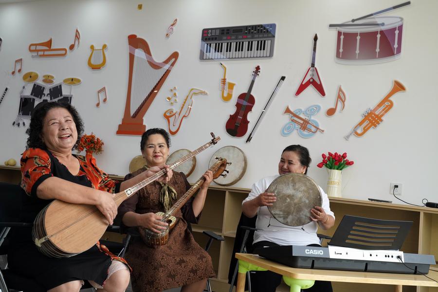 Residents play traditional instruments at a music studio of the Donghu residential community in Kashgar, northwest China's Xinjiang Uygur Autonomous Region, Sept. 22, 2024. (Xinhua/Zhao Yusi)