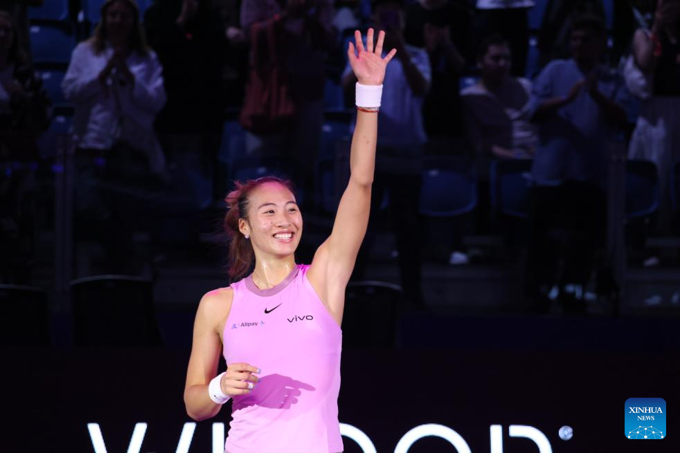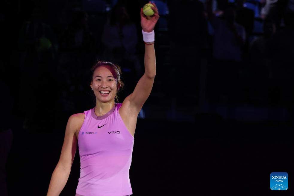 Zheng Qinwen waves to the spectators after the round robin match between Zheng Qinwen of China and Jasmine Paolini of Italy at WTA Finals tennis tournament in Riyadh, Saudi Arabia, Nov. 6, 2024. (Xinhua/Wang Haizhou)