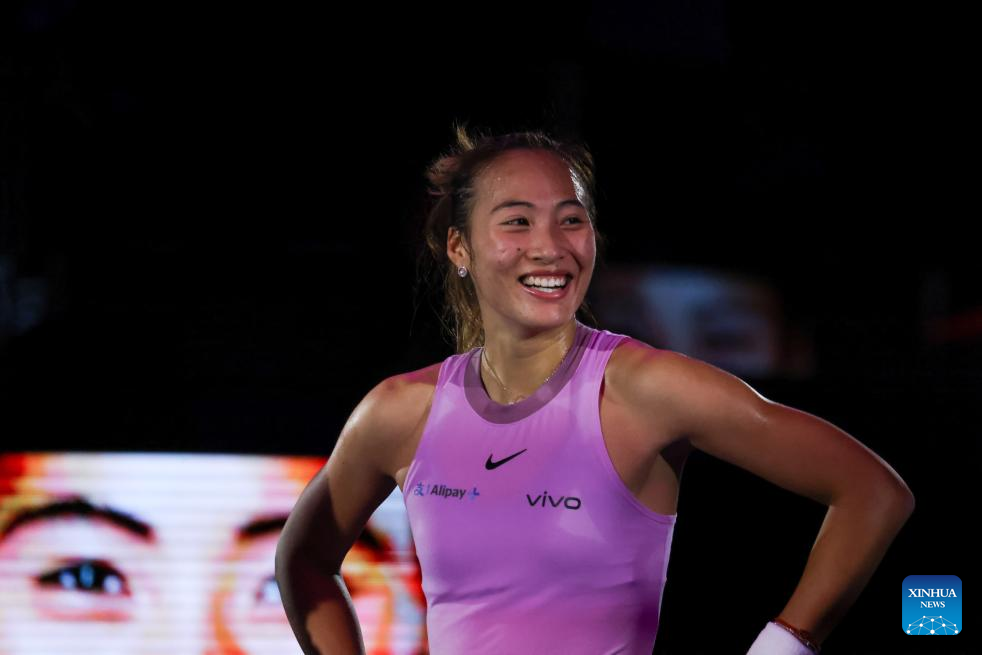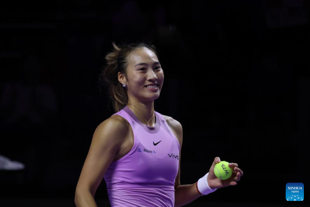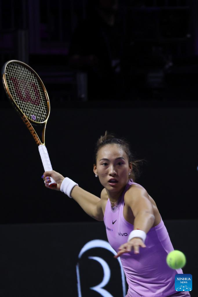 RIYADH, Nov. 6 (Xinhua) -- Paris Olympic gold medalist Zheng Qinwen of China cruised to a straight-set victory over Jasmine Paolini at the WTA Finals here on Wednesday, securing her spot in the semifinals.