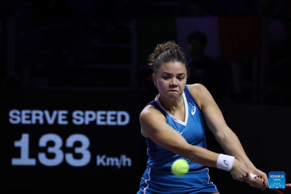Jasmine Paolini hits a return during the round robin match between Zheng Qinwen of China and Jasmine Paolini of Italy at WTA Finals tennis tournament in Riyadh, Saudi Arabia, Nov. 6, 2024. (Xinhua/Wang Haizhou)