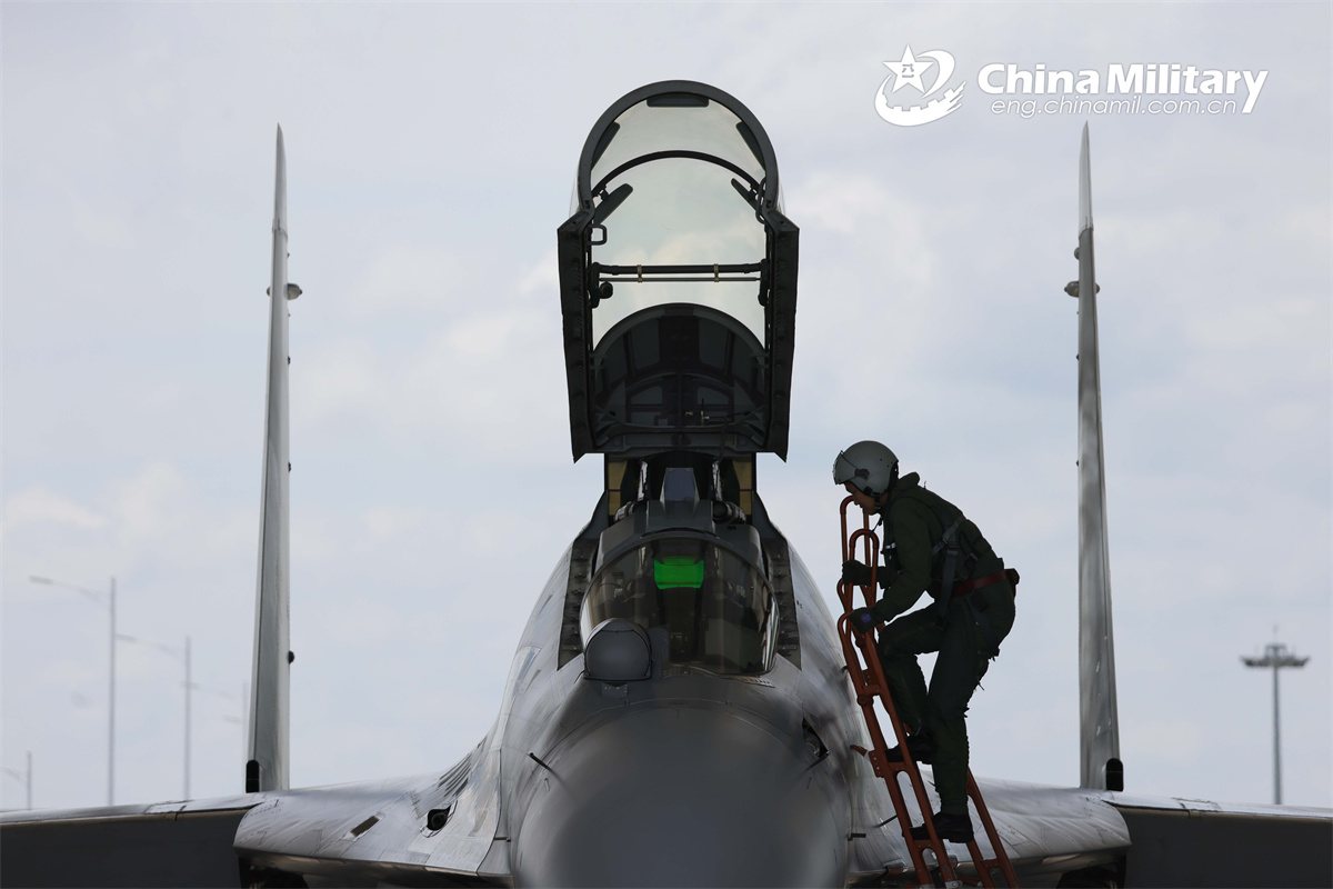 A pilot assigned to an aviation brigade with the air force under the Chinese PLA Southern Theater Command climbs into the cockpit of a J-16 fight jet prior to a multi-subject flight training exercise on August 28th, 2024. (eng.chinamil.com.cn/Photo by Zhang Weishan)