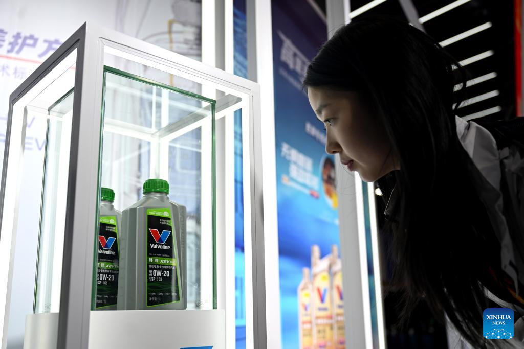 A visitor watches a full synthetic engine oil during the seventh China International Import Expo (CIIE) in east China's Shanghai, Nov. 6, 2024. During the ongoing 7th CIIE, many new technologies, achievements and products met the public for the first time. (Photo by Chen Haoming/Xinhua)