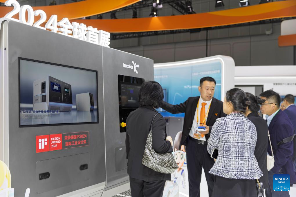 Visitors learn about a fourth generation biobank at the booth of Incaier during the seventh China International Import Expo (CIIE) in east China's Shanghai, Nov. 6, 2024. During the ongoing 7th CIIE, many new technologies, achievements and products met the public for the first time. (Xinhua/Wang Xiang)