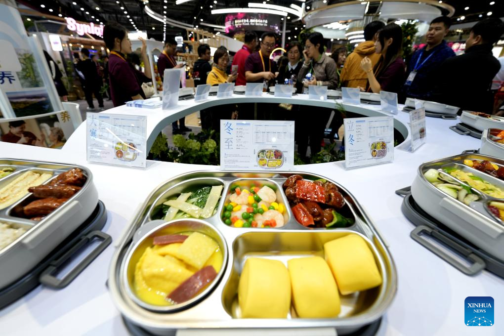 The dietary nutrition prescriptions for sarcopenia are on display at the booth of Shanghai Senior Healthcare during the seventh China International Import Expo (CIIE) in east China's Shanghai, Nov. 6, 2024. During the ongoing 7th CIIE, many new technologies, achievements and products met the public for the first time. (Xinhua/Zhang Jiansong)