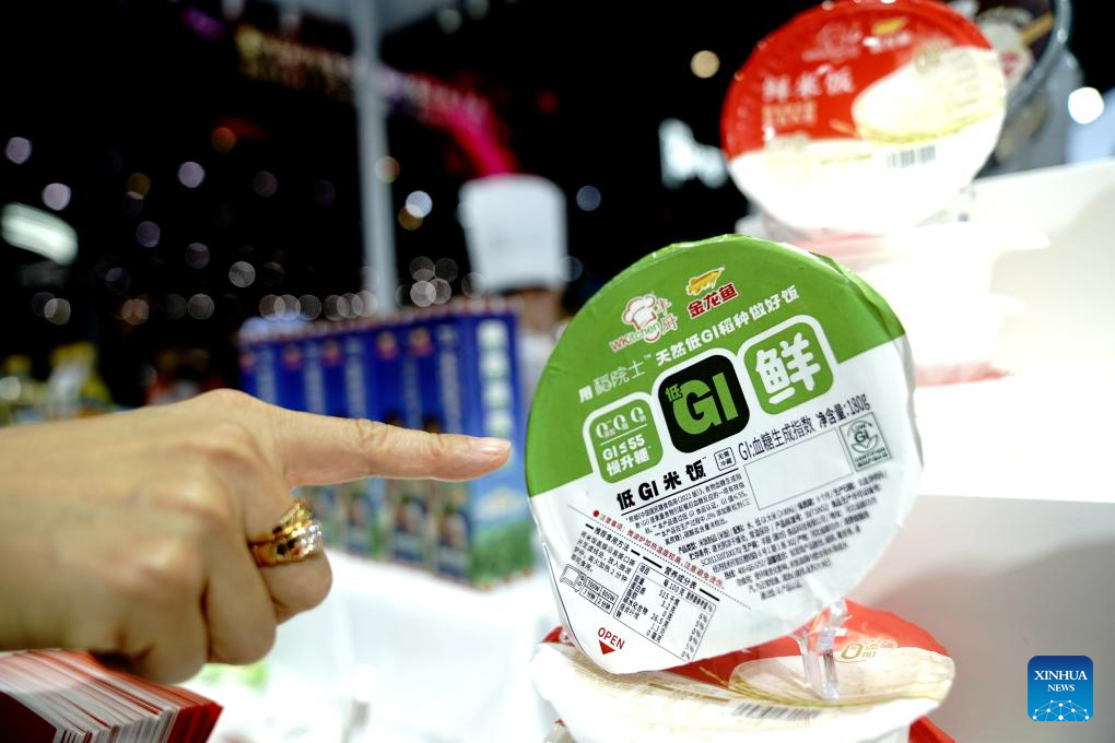 A new rice product is on display during the seventh China International Import Expo (CIIE) in east China's Shanghai, Nov. 6, 2024. During the ongoing 7th CIIE, many new technologies, achievements and products met the public for the first time. (Xinhua/Zhang Jiansong)