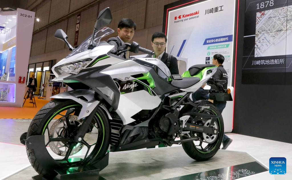 An exhibitor (L) from Kawasaki introduces an electric motorbike to a visitor during the seventh China International Import Expo (CIIE) in east China's Shanghai, Nov. 6, 2024. During the ongoing 7th CIIE, many new technologies, achievements and products met the public for the first time. (Xinhua/Fang Zhe)